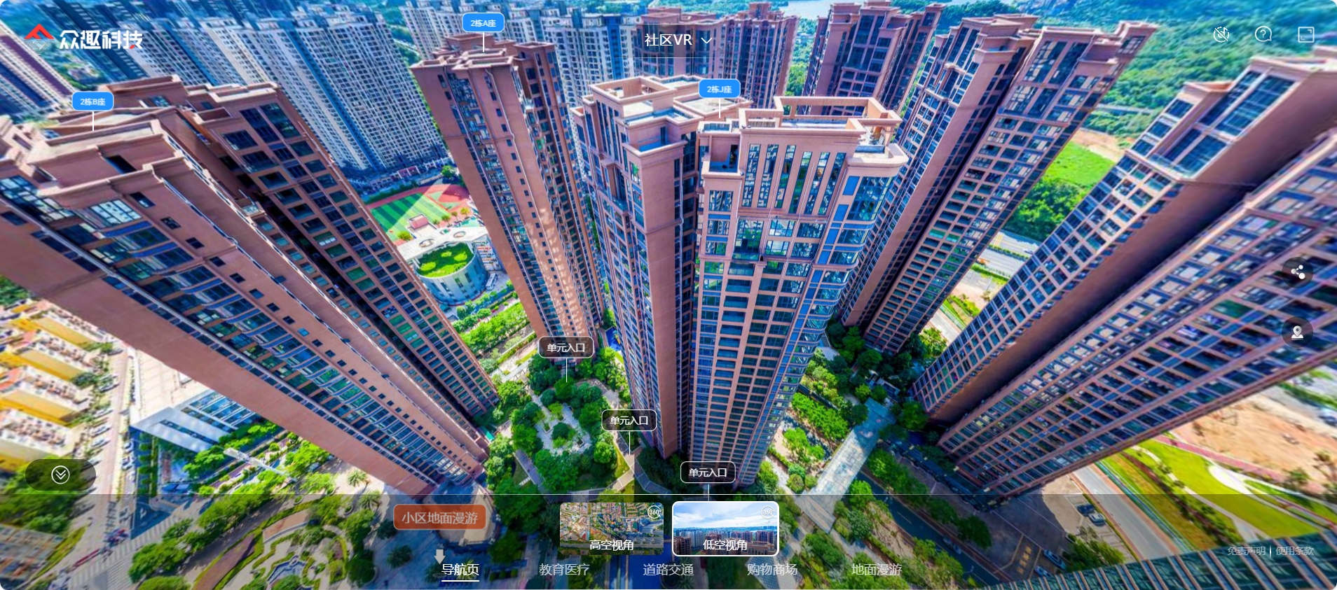 通过全景航拍或倾斜摄影建模全面采集构建社区整体三维数字化体验,购房者可 720° 无死角浏览小区全貌,更加全面的了解社区信息,从楼栋间距、绿化布局到阳台视野,甚至周边学校、地铁、医疗、超市等生活配套情况,均以 1:1 真实还原,无需实地踏勘,客户通过手机或电脑即可“走”进未来家园,直观感受社区的真实生活场景。