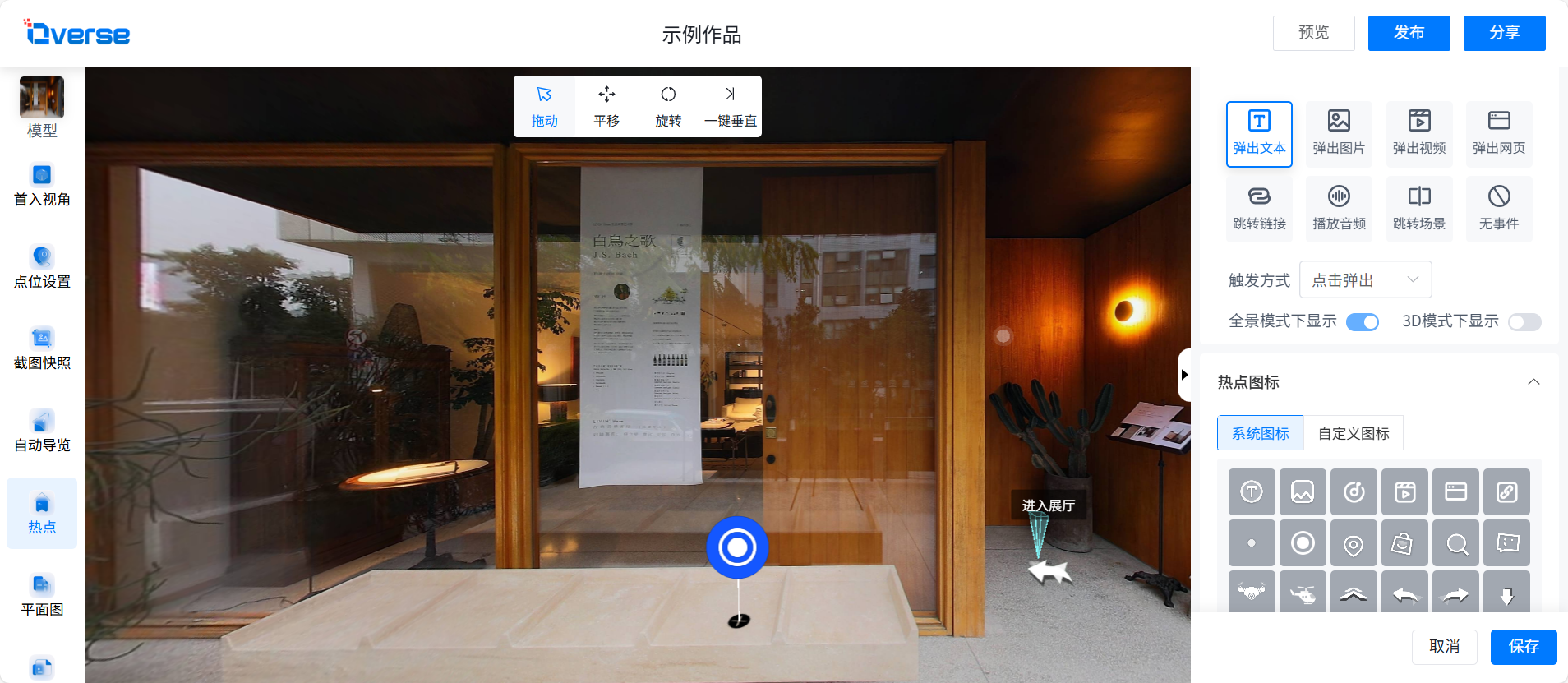 优质的数字化体验,不仅要真实呈现空间,更要让品牌价值被深度感知、并高效抵达用户。通过 Qverse 云平台的编辑功能,您可在特色区域嵌入品牌故事与设计理念,使空间本身成为可阅读、可对话的文化载体。