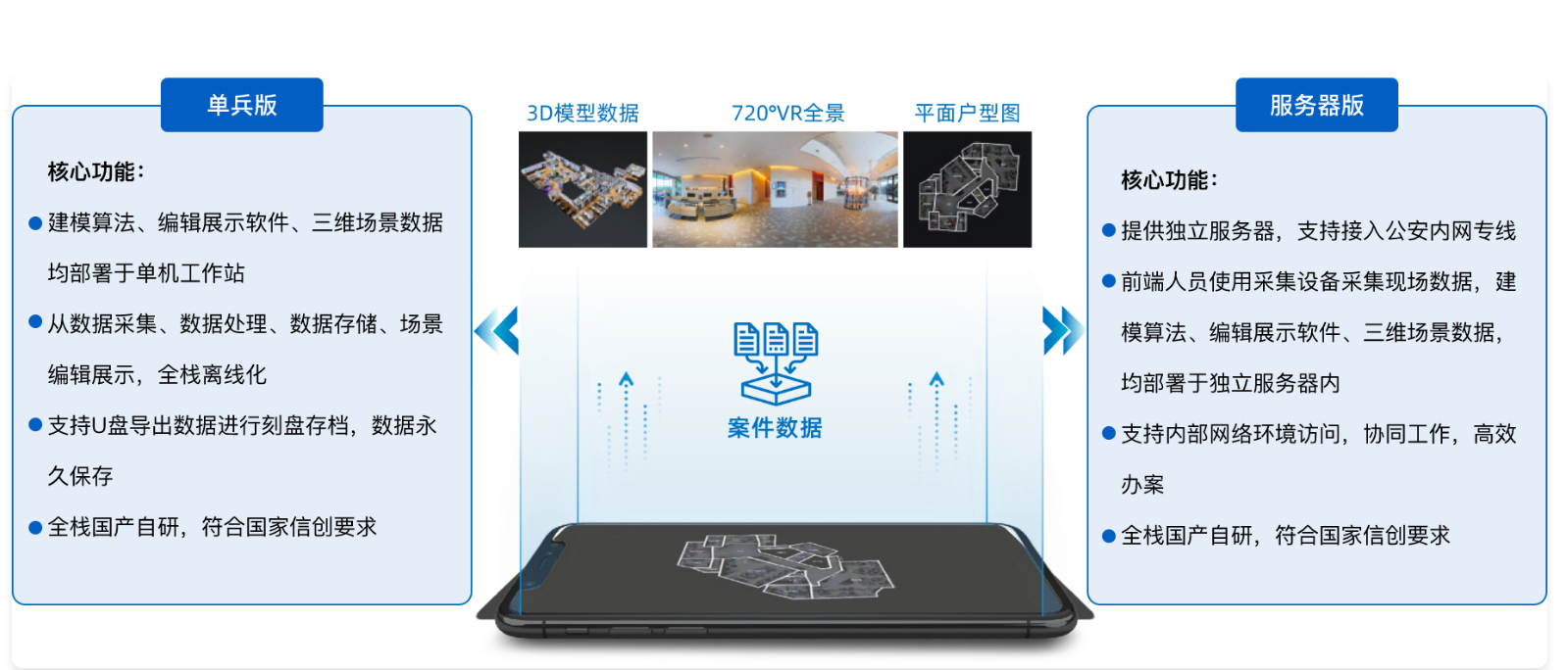 将核心算法、软件与数据全集于一台加固工作站,实现从采集、处理到展示的全流程离线闭环作业。一线警员可独立操作,快速完成现场三维重建与数据导出,通过物理介质保障数据安全,特别适用于高保密、快响应的独立现勘任务。